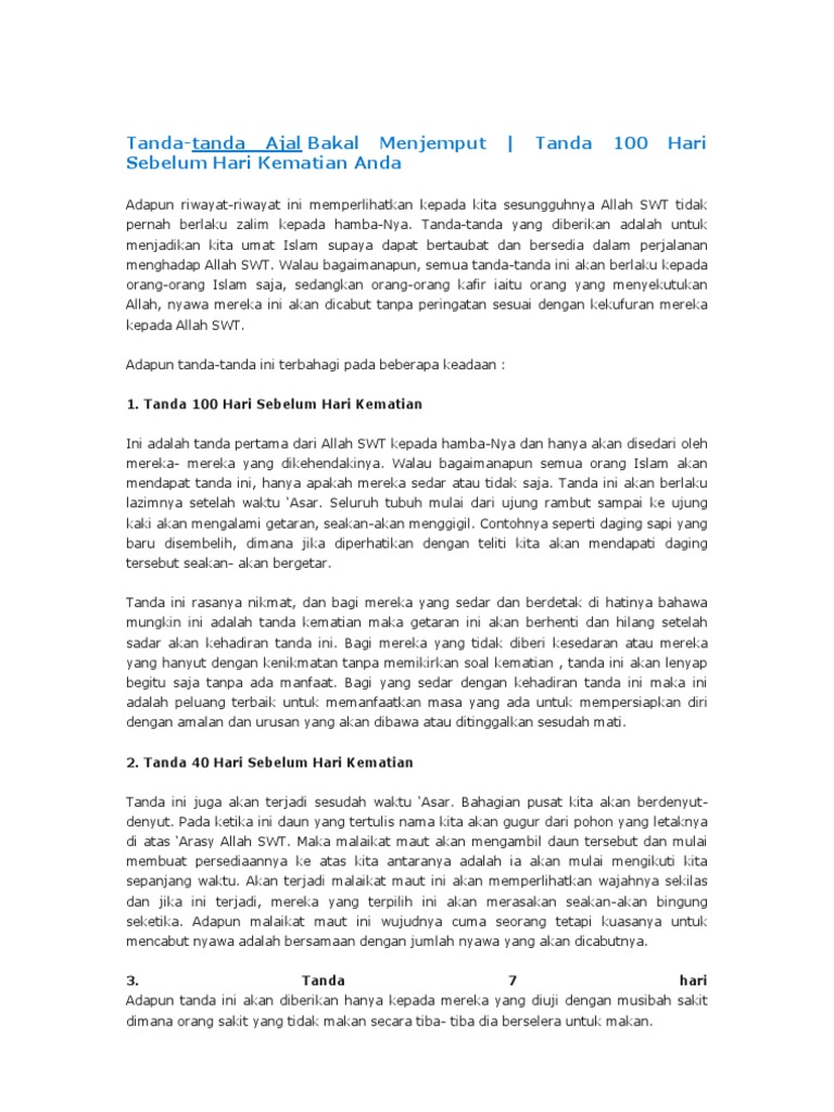 Ustaz wadi annuar @akademi darul iftak. Ketika masa itu tiba tidak ada satu manusia. 100 hari sebelum hari kematian. Dikutip dari tulisan ustad yusuf mansur dari fanspage facebook ustad yusuf mansur dikatakan bahwa tanda 100 hari menjelang ajal : Tanda 40 hari, 7 hari hingga sehari sebelum kematian | dr khalid basalamah ma ini tanda 40 hari, 7 hari hingga sehari.