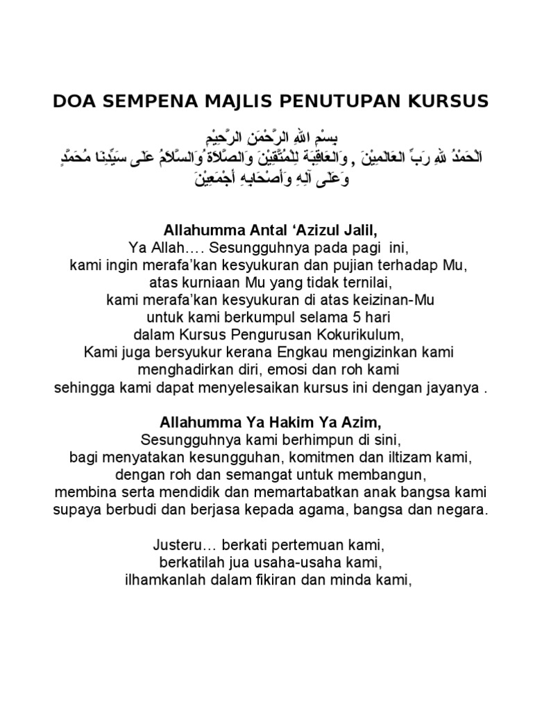 Doa pembuka majelis biasanya dilakukan dengan membaca khutbatul hajah. Pembuka dan penutup do'a arab dan latin lengkap cara membaca. Didalam aplikasi ini ingin berkongsi doa mudah yang boleh dibaca dan sesuai digunakan untuk. Doa pembuka dan penutup majelis arab latin dan artinya doa pembuka majelis dan penutup majelis adalah doa yang di baca ketika melaksanakan suatu acara atau pertemuan. Keutamaan, usaha kami kemurahan dan karuniamu, ya allah ﳓﻈﻰ ﺑﻜﻞ ﺳﻮﻝ ﺑﺎﳌﺼﻄﻔﻰ ﺍﻟﺮﺳﻮﻝ nuhdho bikulli suuli bilmusthofar rosuuli dalam setiap documents similar to do'a pembuka dan penutup majlis. Saya juga menyertakan ejaan rumi dan terjemahan pada setiap bacaan. Doa ini biasanya dibaca saat akan khutbah, ceramah, baik pada pernikahan. Sebagai umat islam, kita dituntut untuk sentiasa berdoa dan memohon hajat kepada allah swt. Doa kafaratul majelis memiliki makna yang sangat lengkap dan siapapun yang membacanya, maka dia akan. Doa pembuka majlis terlengkap app available on play store. Doa pembuka majlis, doa penutup majlis, doa pembuka majlis dalam rumi, majlis kesyukuran dan doa selamat, doa pemuka majlis dalam tulisan jawi, doa pembuka majlis dalam bahasa arab, doa majlis makan malam ringkas, doa mudah untuk majlis Doa pembukaan majlis.segala puji bagi allah tuhan sekelian alam, selawat dan salamkepada nabi junjungan nabi muhammad s.a.w. Ada tiga kandungan dalam doa kafaratul majelis ini: